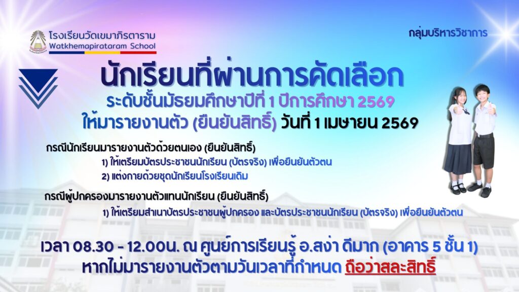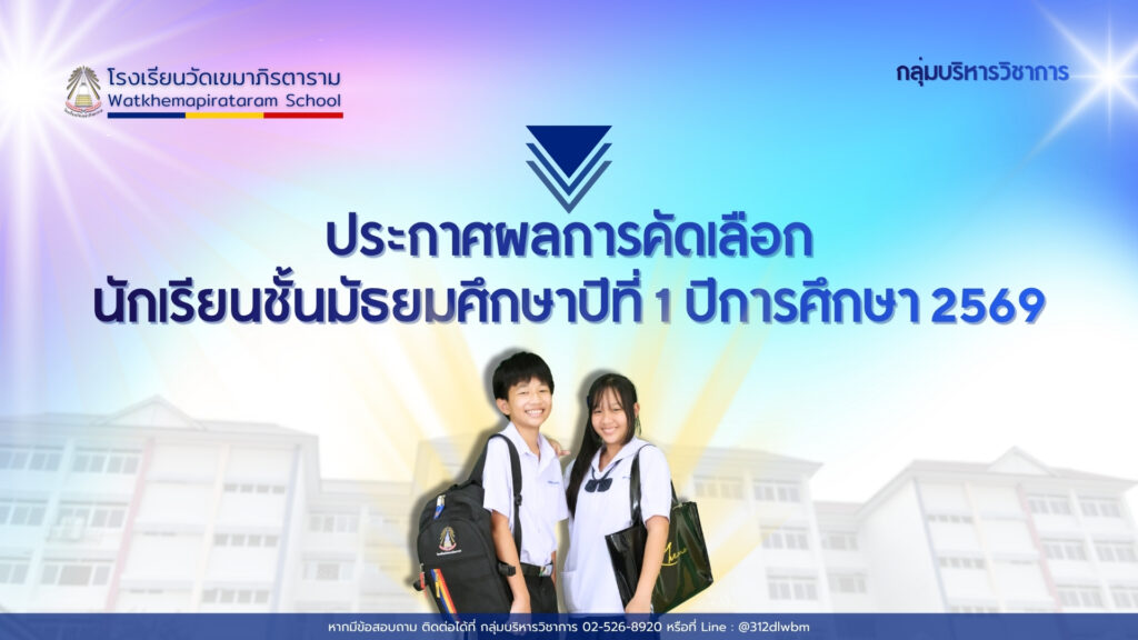 ประกาศผลการคัดเลือกนักเรียนชั้นมัธยมศึกษาปีที่ 1 ปีการศึกษา 2569