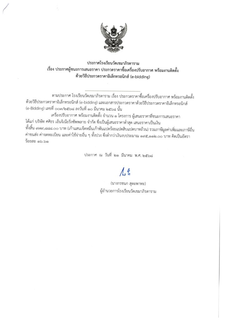 ประกาศผู้ชนะเสนอราคา ประกวดราคาซื้อเครื่องปรับอากาศ พร้อมงานติดตั้ง