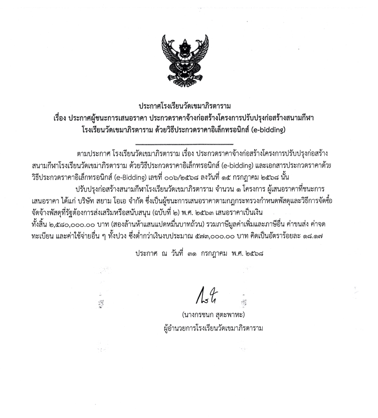 ประกาศผู้ชนะเสนอราคา ประกวดราคาจ้างก่อสร้างโครงการปรับปรุงก่อสร้างสนามกีฬาโรงเรียนวัดเขมาภิรตาราม