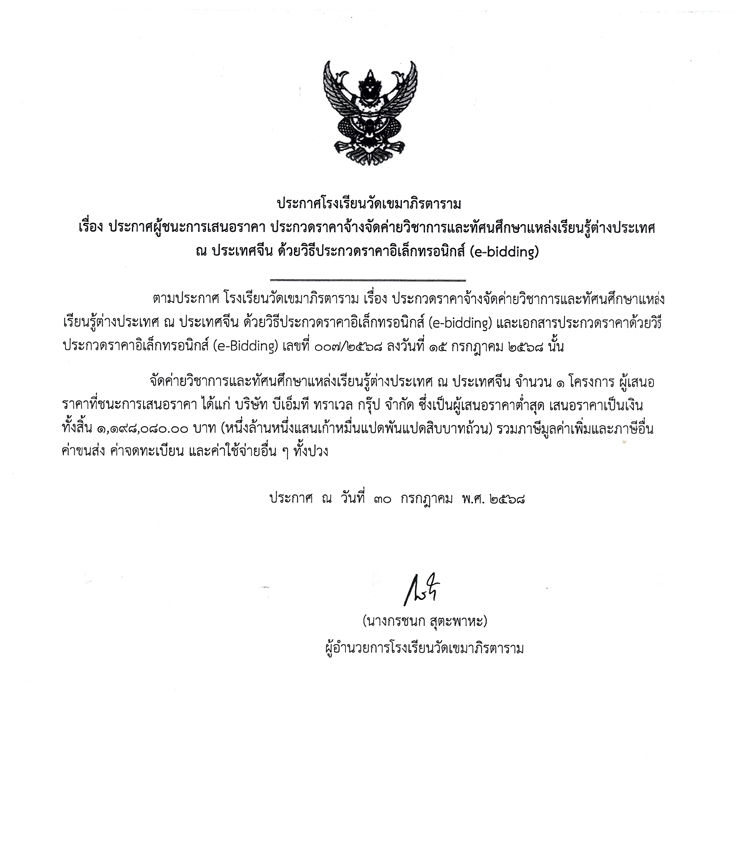 ประกาศผู้ชนะเสนอราคา ประกวดราคาจ้างจัดค่ายวิชาการและทัศนศึกษาแหล่งเรียนรู้ต่างประเทศ ณ ประเทศจีน