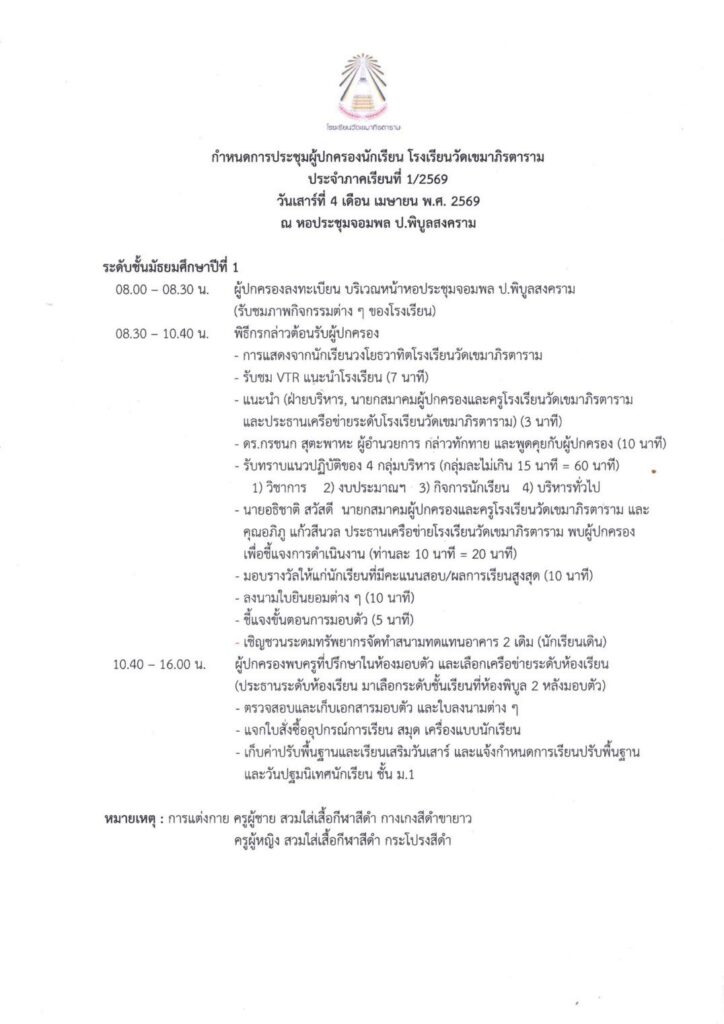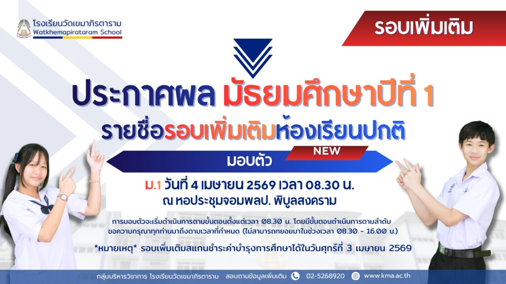 ประกาศรายชื่อนักเรียนชั้นมัธยมศึกษาปีที่ 1 รอบเพิ่มเติม ห้องเรียนปกติ ปีการศึกษา 2569