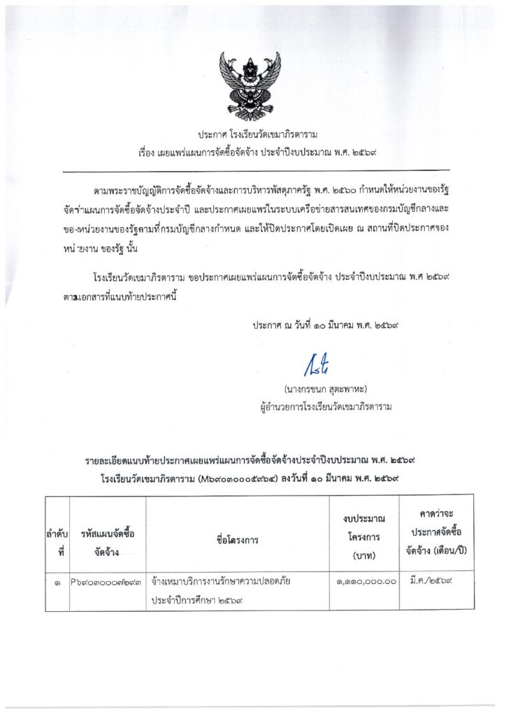 ประกาศ จ้างเหมาบริหารงานรักษาความปลอดภัย ประจำปีการศึกษา 2569
