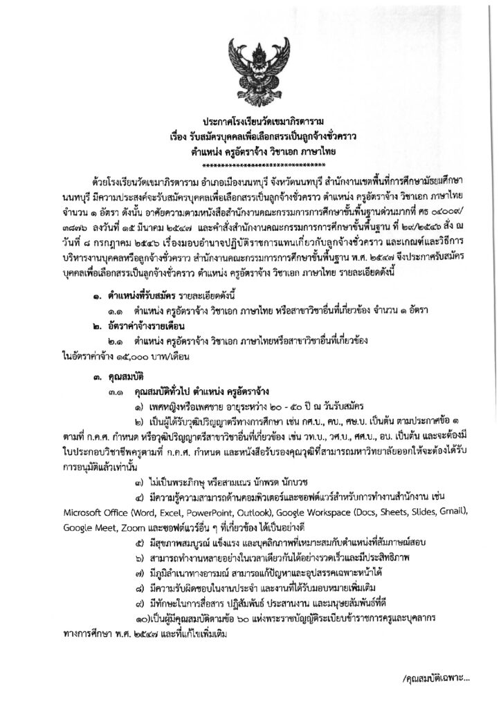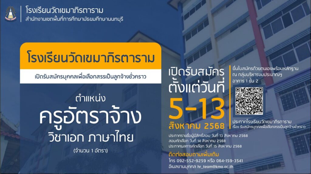 รับสมัครบุคคลเพื่อเลือกสรรเป็นลูกจ้างชั่วคราว ประเภท ครูอัตราจ้าง วิชาเอก ภาษาไทย
